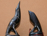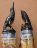 One has a frog stopper, and the other has a water bird stopper, both hand carved in rich dark wood:
