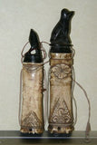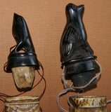 Choice between 2 pieces with buffalo bone hand etched body and ebony carved lids: one has a frog stopper, hand carved in rich dark wood and the other has a detailed and large bird stopper: