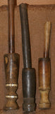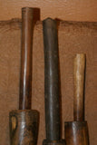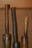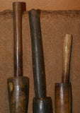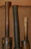 These 3 pieces are very old, each unique with a nice patina too, hand carved light or dark wood with nice hand carved or etched motifs on the pestle or the cups, created with rudimentary tools.