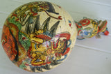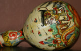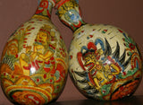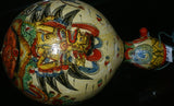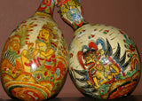 The Gourd designs represent shadow puppets or wayang kulit and scenes of the Ramayana tales and Mahabaratha epics as per the very old tradition of the Kamasan style, originated within the Java Royal courts of past centuries. It is painted all around, including the bottom which has a large red face to ward off evil.