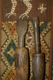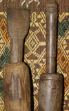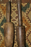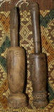 One set is very old, unique with a nice patina too, hand carved wood with nice geometric motifs on the cup, the other is newer, from the 1970’s, also one of a kind and hand carved: the cup was created with variegated wood, cup and pestle have incised geometric motifs.