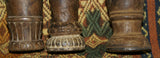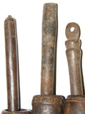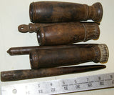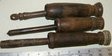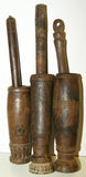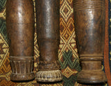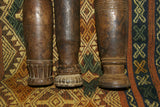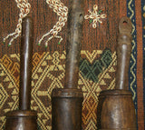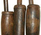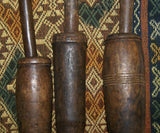 The 2 pieces available, seen on the left and right (the middle one has been sold) are very old, each unique with a superb patina too, hand carved wood with some motifs on the pestle and the cup, created with rudimentary tools.