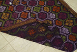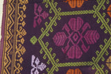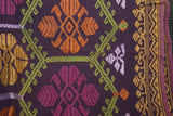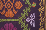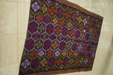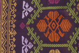Handspun Handwoven silk blend with colorful threads' embroideries done by hand. In great shape for its age, we were told it was 100 yrs old by the owner. The textile consists of 2 panels once each woven in a regular loom and passed on as heirlooms from mother to daughter and so on, and much later they were sewn together as a sarong to be used in court ceremonies. The textile is in great shape for its agebut I noticed, with difficulty, 8 pin holes when I looked in front of the light as they are not easily noticeable otherwise.