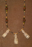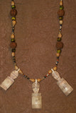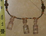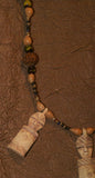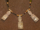 Unique Vintage Hand crafted Ethnic Glass Trade Beads, Rudhaccha Seeds & Seed Beads Necklace with 3 Buffalo Bone Hand Carved Pendants of Protective Ancestor Effigies for Good Luck, Health & Prosperity, Borneo, Indonesia NECK11+ 1 Flapper Coconut necklace.