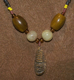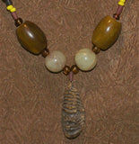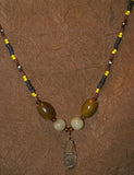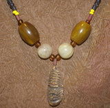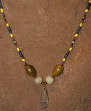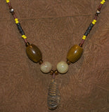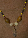 Unique Earthtones Hand crafted Ethnic Glass Trade Beads Necklace with Buffalo Bone Hand Carved Pendant of Protective Ancestor for Good Luck, Borneo Kalimantan, Indonesia NECK32 + 1 Flapper Coconut necklace.