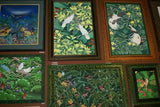 These wonderful nature jungle scenes with birds, tropical plants and flowers, by a famous Ubud artist, are vibrant and cheerful and also very large, and we have heard over and over from clients that buy them that once on the wall, they feel like they have an opened window to a luxuriant rain forest, and that is is so uplifting and brings happiness on a rainy day for example as it lightens the whole room. Reminds me of the Douanier Rousseau intensely detailed tropical art, a Famous French impressionist from the past that created similar extremely detailed paintings of forest scenes with animals hidden in the foliage.