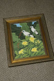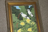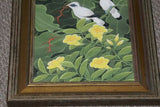 You are buying an original, unique, framed, acrylic painting on canvas with great delicate detail representing starling birds in tropical scenery and yellow hibiscus background.