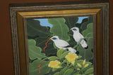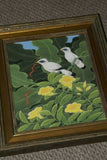 FRAMED 19”x 15.5” ORIGINAL DETAILED COLORFUL BALINESE PAINTING ON CANVAS BY RENOWN UBUD ARTIST RAINFOREST PARADISE WITH NATURE FOLIAGE HIBISCUS STARLING BIRDS BANANA LEAVES DFBB45 DECORATOR DESIGNER ART COLLECTOR ARTWORK MASTERPIECE