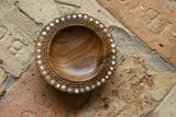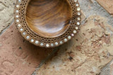 STUNNING 1 OF A KIND HAND CARVED KWILA WOOD MUSEUM MASTERPIECE SAGO PLATTER DISH BOWL WITH MOTHER OF PEARL INSERTS & DELICATE LACY INCISED BORDER BY RENOWNED TRIBAL SCULPTOR 5.25X5.25X1 TROBRIAND ISLANDS MELANESIA SOUTH PACIFIC DESIGNER COLLECTOR 2A58