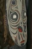 .You are buying the tall (full body adult size 5 feet) Tiki Savi statue collected 20 years ago directly from a spirit house or Haus Tambaran, entirely hand carved by an artist from the Sepik River province, adorned with hand painted pigment motifs that have not faded, nassa shells (inserted in the forehead) and a crown of cassowary feathers as an additional headgear decoration (as worn by the warriors) and sealed in river mud. The ancestor face eyes are spiral shell sections (conus shell) and his ears are decorated with hand twisted natural bark twine.
