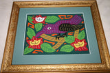 Professionally Framed Folk Art Mola Applique Panel. Handstitched Textile by an American Indian kuna Seamstress. Motif of Hummer / Humming Bird Surrounded by Tropical Plants and Colorful Flowers. Professionally Stretched & Matted in an Acid-Free Mat, Custom Framed in a Gold Frame & Under Glass.