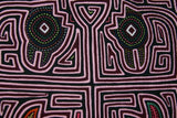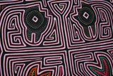Collectible Handsewn Traditional Mola Applique. Handstitched Textile by an American Indian Kuna Seamstress. Hard to Find Motif Style, Geometric Mirror Image Motif of Birds Morphing into Fish. Traditional Maze Background Inspired from the Brain Coral that Surrounds the Islands.