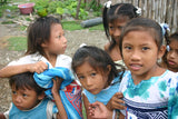 Additional pictures placed here also show a variety of photos from our trips such as my husband distributing goods to the Indian community, village scenes, a mola being started, a Kuna woman wearing one, and also how they can be used in your home to create a great cheerful and colorful one of a kind accent.