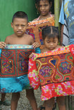 Additional pictures placed here also show a variety of photos from our trips such as my husband distributing goods to the Indian community, village scenes, a mola being started, a Kuna woman wearing one, and also how they can be used in your home to create a great cheerful and colorful one of a kind accent.