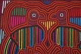Collectible Handsewn Folk Art Mola Applique. handstitched Textile by an American Indian Kuna Seamstress. Motif of Love Birds Within a Heart Shape and Traditonal Parallel Lines Background.
