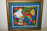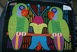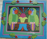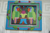 Professionally Framed Folk Art Mola Applique Panel. Handstitched by an American Indian Kuna Seamstress. Motif of Green Parrots / Love Birds with the Traditional Parallel Lines Background. Professionally Stretched & Matted in 2 Acid-Free Mats, one pink, one green, then Custom Framed in a Handpainted Frame with leaves in relief, Signed by the Artist and Under Glass.