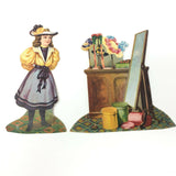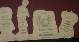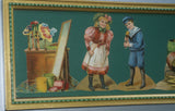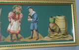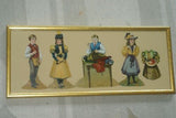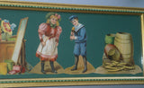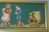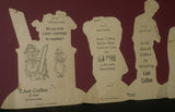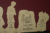RARE, AUTHENTIC, 1800'S ANTIQUE VICTORIAN AD EPHEMERA TRADE CARDS, FRAMED & MATTED. DIE CUTS OF LION'S COFFEE PAPER DOLLS (5 PIECES): A SAILOR, A MILLINER AND HER HAT DISPLAY, BARRELS FOUND ON DOCKS AND AN EXTRA COSTUME IN BACK OF FRAME.