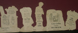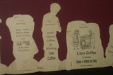 5 DIFFERENT DIE CUT PIECES FROM VARIED LION'S COFFEE ADVERTISEMENTS COMBINED TOGETHER IN A VINTAGE HAND PAINTED FRAME WITH MAT AND GLASS.