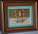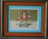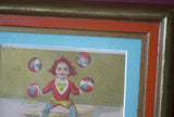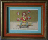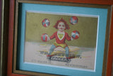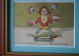 RARE EPHEMERA AMERICANA WHIMSICAL ART: 1880's FRAMED VICTORIAN TRADE CARD: THURLOW GROCER, CIRCUS JUGGLER BOY, NEWBURYPORT (DFPO1U) VINTAGE FRAME DESIGNER COLLECTOR COLLECTIBLE DELIGHTFUL WALL DÉCOR UNIQUE