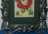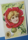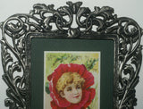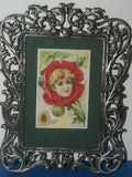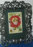 EPHEMERA AMERICANA ANTIQUE WHIMSICAL ART 1887 IN ORNATE FRAME & MATTED, ANTIQUE VICTORIAN ADVERTISING TRADE CARD OF POPPY GIRL: J.& P. Coats (DFPO2J) LACY METAL FRAME 8,5" X 6",5 DESIGNER COLLECTOR COLLECTIBLE WALL DÉCOR
