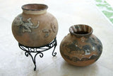 1980 Primitive Hand Crafted Vermasse Terracotta Pottery, Vessel from East Timor Island, Indonesia: 3D Raised Relief Decorative Motifs of man & gecko colored with natural earthtone Pigments 9" x 8" (28" Diameter) P29A