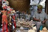 The master carver makes the head because it expresses the personality of the character. Puppets are divided in 3 parts: the head and neck are connected to a sharpened bamboo piece that goes thru the separate body, enabling the puppet to turn its head left and right. From the waist down a sarong type cloth is worn hiding the puppeteer's hand that holds the bamboo piece. The joints of the articulated arms are connected with a string enabling the puppet to move his upper limbs as well. The central support rod is attached to the base of the body where it is hidden by the clothing. The women make all the batik costumes.