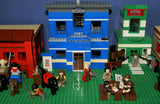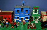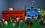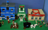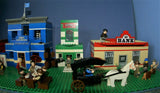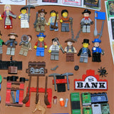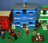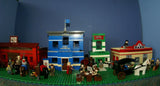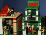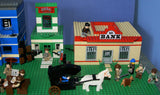 IN ALL, THERE ARE 4 CUSTOM LEGO SETS HERE, A LARGE WITCH'S STORE, FORT LEGOREDO HEADQUARTERS, A PROSPECTOR SHOP AND A BANK, 26 MINIFIGURES ALL SEEN ON PHOTO 2, 5 HORSES AND OTHER ANIMALS, 1 STAGE COACH.