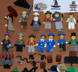 26 MINIFIGURES: 26 HEADS, 26 BUSTS, 26 PANTS OR SKIRTS, 26 HATS OR HAIR, 5 SCARVES, 1 MIRROR, 4 PISTOLS, 3 GUNS, 1 SPYGLASS, 1 PRISONER CHAIN, 1 UMBRELLA (2 PCS), 1 DOG, 2 PICKS, 1 MAGNIFYING GLASS, 1 PACKAGE, 1 DYNAMITE STICK, 1 BAG WITH MONEY, 1 BROOM, 2 BLACK FLAT PCS = 131 PCS