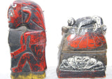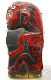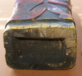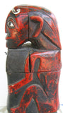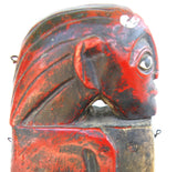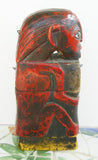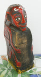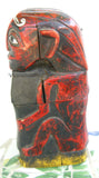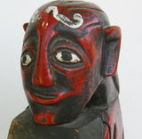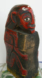 HAND CARVED AND HAND PAINTED, LONG AGO. VERY UNIQUE RED DEMON KELANA WOODEN PURSE, INTERESTING MOTIF, HAS SOME METAL LOOPS ON THE SIDES TO RUN A CORD THRU AND WEAR AS A PURSE FROM THE SHOULDER, AS USED TO BE THE WAY TO CARRY IT.