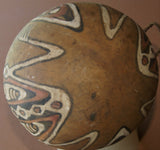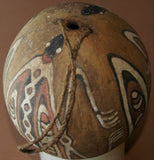 Extremely rare & very decorative Hand carved & Hand painted Lime Gourd Receptacle from Lake Sentani, Irian Jaya, West Papua. The nice traditional designs from the region that decorate it were created with natural dyes such as charcoal and lime. A hand twisted twine made of bark or plant material allowed it to hang from a man’s belt.
