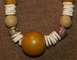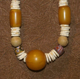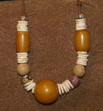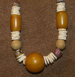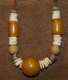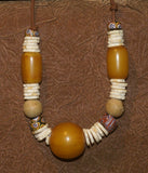NECKLACE NECK25: BRIDE PRICE NECKLACE COLLECTED IN THE SAHARA DESERT IN 1970 CREATED WITH AMBER BEADS, SHELL RINGS, WOOD BEADS, AND COLORFUL GLASS BEADS.