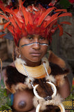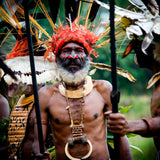 Warriors wear kina shells as displays of wealth and focus of their dress.