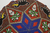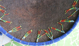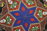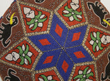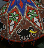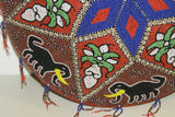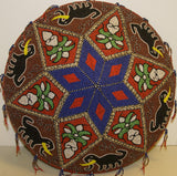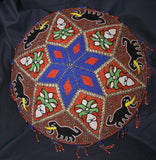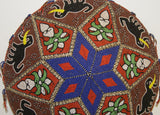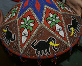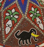 The pattern here displays elephants, sacred orchid flowers, and geometric shapes, topped with a star. Additional adornments of small Nassa shell borders, and beaded fringes all around the rim, complete this marvelous and unusual collectible.