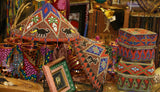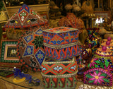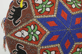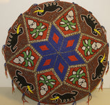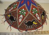 We are showing detailed pictures of this lovely (entirely beaded by hand with a needle) hat, adorned with a tapestry of thousands of minute millimeters’ and colorful antique glass trade beads, hand beaded one by one to form beautiful intricate motifs, and hand stitched within a coolie hat frame to create a mosaic of traditional designs on the outside (with the help of a spider web network of strings as one is seen being made on some the photos), and tightly woven on the inside.