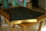 ITALIAN FLORENTINE MARBLING MOTIFS ON THE INSIDE OF THE BOOK COVER, 18 C. PATTERN BASED PAPER, MARBLED ON LAID, ANTIQUE, HANDMADE LINEN RAG PAPER, AND GILT-EDGED PAGES WITH 24 KARAT GOLD-LEAF AND RED RIBBON PAGE MARKER.