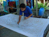 Together, we created unique colorful tropical motifs in small quantities (and let the artist improvise from there) so we have only 5 each pattern of each at most, making them more unique. The artists that painted them for us are some of the best in Bali, with an extremely great sense of design, color combination and detail, the result being these one-of-a-kind outstanding pieces that you will not find anywhere else. These are high quality pieces, not the average wrap-around. The painting process is time consuming and an exercise in accuracy as dripping often occurs in spite of the wax dividers. Enjoy this unique and very decorative work of art.