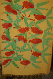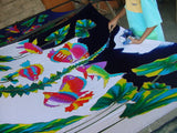 HIGH QUALITY HANDPAINTED TEXTILE, FABRIC SARONG SIGNED BY THE ARTIST. VIBRANT COLORS WITH DETAILED MOTIFS OF ODONTOGLOSSUM ORCHID FLOWERS, WITH FRINGES. ORANGES, YELLOWS AND GREENS.