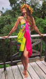 Sexy Skirt, Quick Bathing Suit Cover-up or Beach mat, Shawl, Scarf, Tropical cheerful Wrap, Belt, Toga Dress, Pool Party Wear, Tablecloth, Curtains or drapes, Turban, Wall Art (we have hand carved hanging rods to hang it from), Throw cover for chairs or couches, also as a gorgeous unique colorful Fabric to make one of a kind clothes or pillows with.