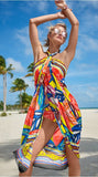 Sexy Skirt, Quick Bathing Suit Cover-up or Beach mat, Shawl, Scarf, Tropical cheerful Wrap, Belt, Toga Dress, Pool Party Wear, Tablecloth, Curtains or drapes, Turban, Wall Art (we have hand carved hanging rods to hang it from), Throw cover for chairs or couches, also as a gorgeous unique colorful Fabric to make one of a kind clothes or pillows with.