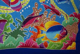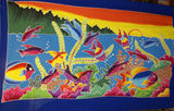 HIGH QUALITY HAND PAINTED TEXTILE FABRIC SARONG WITH FRINGES, SIGNED BY THE ARTIST. VIBRANT COLORS, UNDERWATER OCEAN REEF LIFE WITH FISH AND AQUATIC PLANTS. LOTS OF DETAIL.