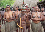 To this day, the tribes reject new ways and any form of clothing, other than the grass fiber skirt for the women and the chest ornaments and horim or koteka for the man (gourd penis cover).