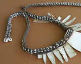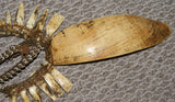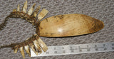 This outstanding old spoon-shaped necklace, made from a giant Tridacna Clamshell called mikak with a woven band surmounted with numerous nassa shells, was acquired by trade with coastal tribes. It was worn as an emblem of prestige by elder warriors. The side of the shells with the brownish patina – wonderfully aged from years of wear – was worn against the chest of the bearer while the lighter underside faced outward.