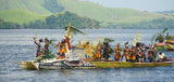 There used to be an old sea inlet which had been separated from the ocean by a volcanic eruption: this is the reason why ocean fish such as swordfish occur on the cloths. Traditionally, pieces of bark cloth were painted with patterns such as wavy lines and spirals (Spirals symbolize the swirl of waves on the lake). The current style, characterized by separate figures that seem to float freely in space, is probably a development of the 1920s and ‘30s.