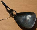 HAND CARVED ETHNIC TRIBAL BUFFALO HORN LIME SCOOP, LARGE SPOON USED DURING FESTIVITIES, RITES OF PASSAGE ETC... COLLECTED ON THE PREMISES IN THE LATE 20TH CENTURY, INDONESIA, ITEM 250C 8” X 4 1/2” PROTECTIVE ANCESTOR HANDLE. BETEL NUT PARAPHERNALIA.