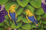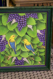 This is a tropical scene, a painting on canvas, with tropical birds, tropical scenery, vines and berries etc...