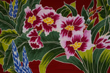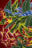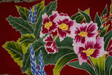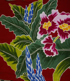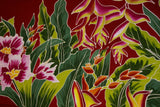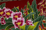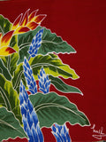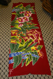 HIGH QUALITY HAND PAINTED TEXTILE FABRIC HALF SARONG OR BEACH SKIRT, SUMMER TABLE RUNNER, SIGNED BY THE ARTIST: DETAILED MOTIFS OF BLOOMING HIBISCUS ON RED BACKROUND, RICH COLORS 74" x 23" (no SC12)