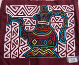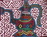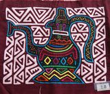 Kuna Indian Traditional Quilted Mola Blouse Panel from San Blas Islands, Panama. Hand Stitched Folk Art Applique: Colorful Tea Kettle Motif in Labyrinth Maze 13" x 11" (2B)