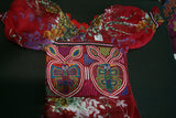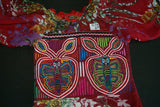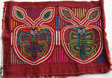 Kuna Indian Traditional Quilted Mola Blouse Panel from San Blas Islands, Panama. Hand Stitched Folk Art Reverse Applique: Butterfly on Apple, mirror images with Intense Parallel Background 14" x 10 1/4" (1A)
