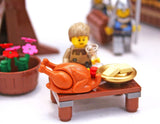 he two buildings, which I’ll get to in a minute, aren’t just the bulk of the set either. You get a small weapons stand for the soldiers. A cart full of tan hay bricks that either the horse or cows can pull around. There’s a small stand where your mini-figures can buy/sell apples, fish, and flowers from barrels. There’s a large tree, that’s leaves can hold both the flower blooms and the apples. There’s a table fit to hold a feast of a roasted turkey with removable drum sticks, a knife, a plate to hold your cut bread squares and cheese triangles, and various cups to drink from.