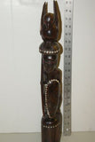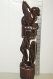 Rare unique hand carved detailed item, carving mastery, minute details: Warrior is dressed for war with his spear and shield decorated with motifs of skull and bones, there is a bird headgear on his head (to instigate fear in the opponent) and long tail feathers from a cassowary fall on the man's shoulders , he wears a small wrapped around banana leaf loincloth (seen on photo 11 on a boy from the Islands, at the end of a long line of children. He has armbands and leg bands made out of local woven plant fiber (as seen on some of the natives on the photos as well), decorations hanging from his ears and a head band on his forehead with tiny red inserts of beads, some are missing, statue is older and was collected years ago and was part of our private collection.